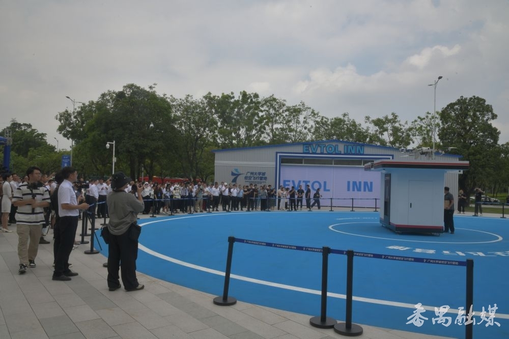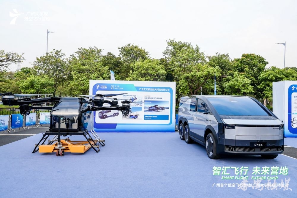 启动仪式结束后,在广州大学城·中关村青创汇的广场上,一场精彩的低空技术演示拉开帷幕。一架八旋翼无人机缓缓降落,精准悬停在一个无人机柜上方。它的舱门自动打开,一个包裹平稳落下,被下方的无人快递车接驳载入。几米外,另一架造型科幻的飞行器正腾空而起,引来阵阵惊叹——这是广东汇天“陆地航母”X3-F的飞行演示现场。