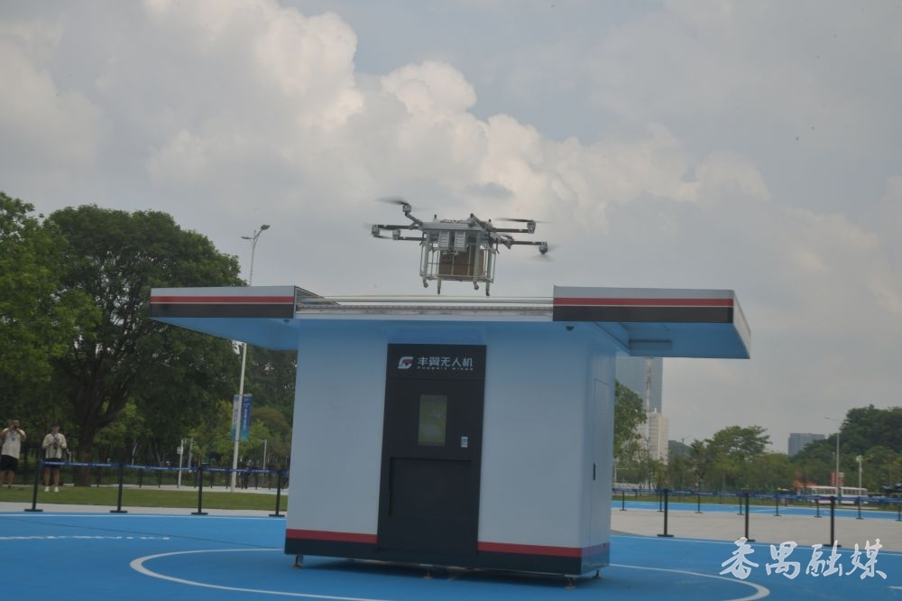 活动现场,顺丰方舟40无人机从广东工业大学校区起飞,沿着预设航线飞行约4公里后,精准降落在青创汇广场的丰翼无人机柜。整个过程不到4分钟,而同样的路程,在地面交通状况理想的情况下,至少需要10分钟。